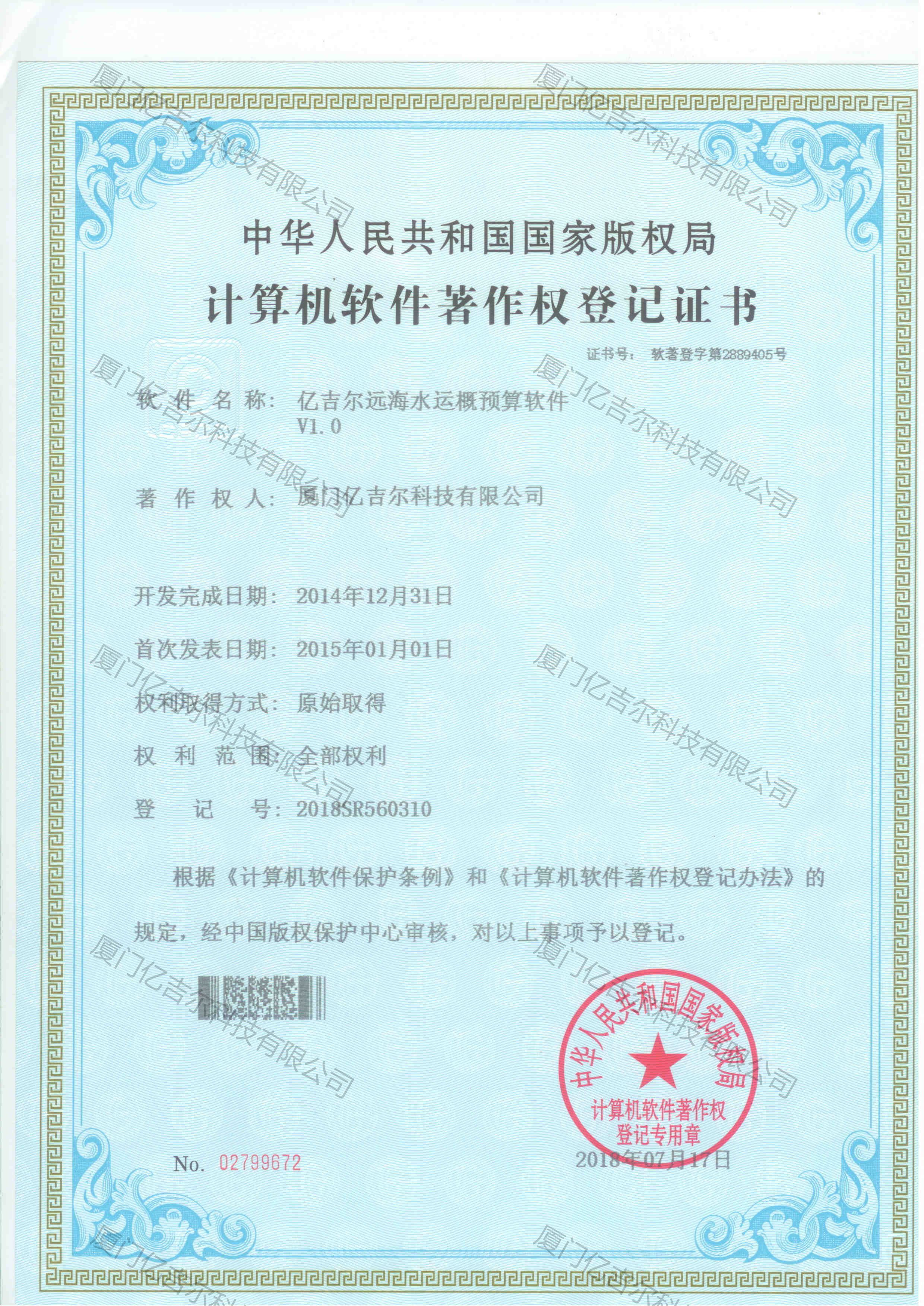 億吉爾遠(yuǎn)海水運(yùn)概預(yù)算軟件著作權(quán)登記證書 發(fā)布日期:2018年07月17日 瀏覽次數(shù):4211 關(guān)鍵字: 公司 1/1億吉爾遠(yuǎn)海水運(yùn)概預(yù)算軟件著作權(quán)登記證書